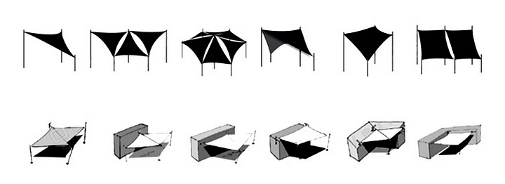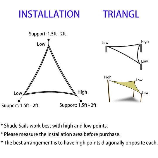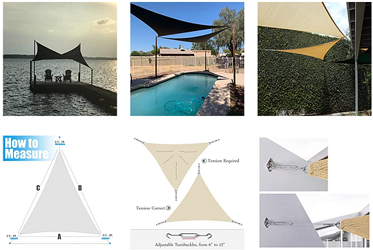 • Sunshade sails have curved sides to enhance pull strength and prevent drooping. (Middle-center of the sun shade will be shorter in width due to curves)